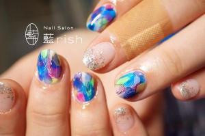 孔雀の美しい虹色の羽根から連想させ製作した作品。